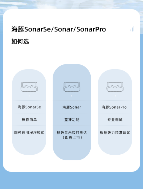 海豚系列助听器分为【海豚SonarSe】【海豚Sonar】【海豚SonarPro】三个款式,满足不同听损人群的需求。